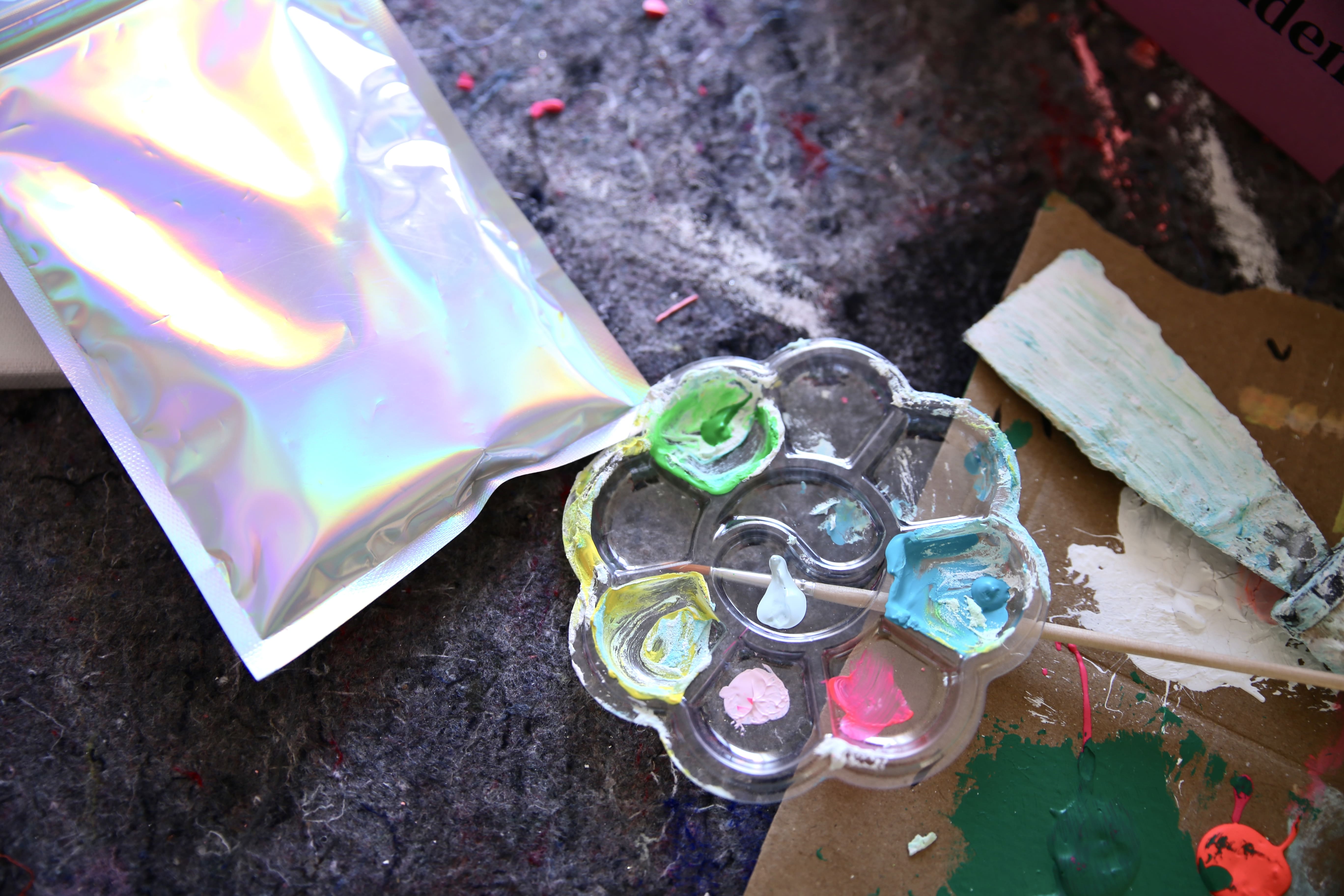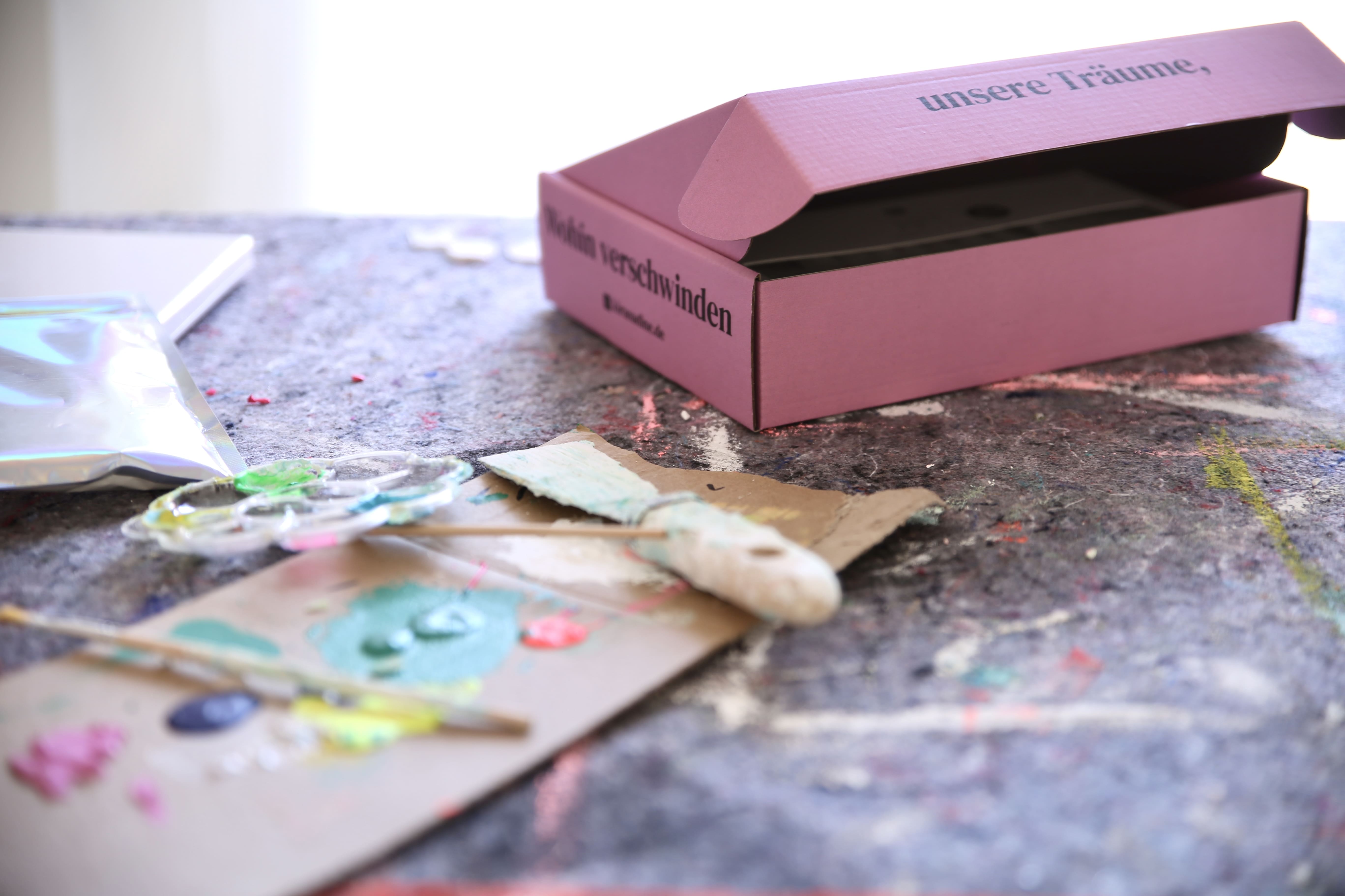 Aber du findest in deiner Box ausgewählte Materialien, mit denen du direkt loslegen kannst: eine kleine Leinwand, ein Material zum Anrühren und Gestalten, Farben und liebevolle Extras.